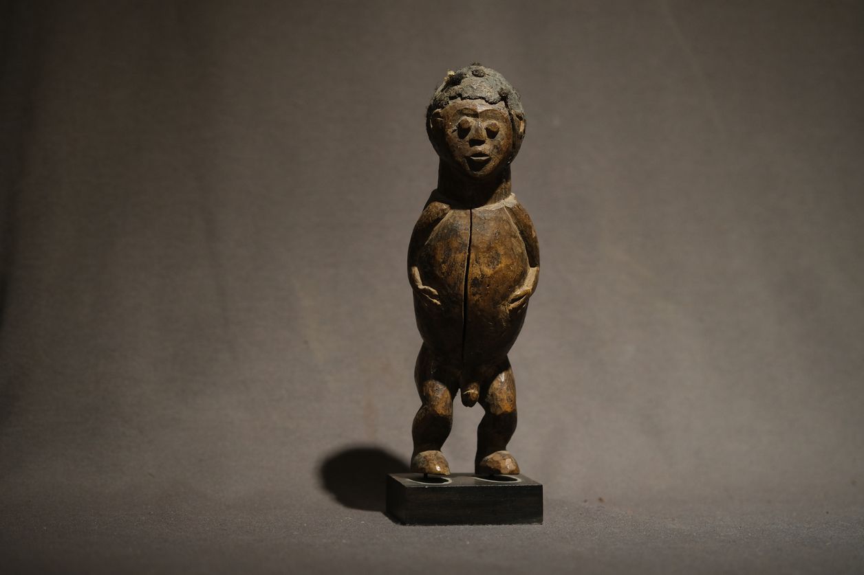 Small standing male ancestor figure from the Kom–Oku cultural sphere in the Western Grassfields of Cameroon. Carved in hardwood with a compact, volumetric body, slightly bent legs, and hands held against the abdomen — a posture commonly associated with contained spiritual presence and lineage authority.